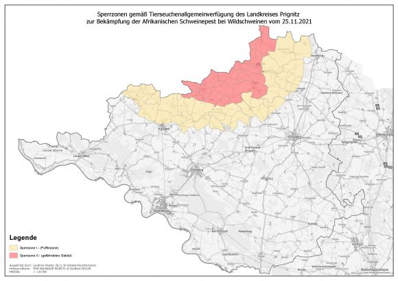 14. Frisches Schweinefleisch oder Schweinefleischerzeugnisse, tierische Nebenprodukte und Folgeprodukte, Sperma, Eizellen und Embryonen, die von Schweinen in einem Betrieb in der Sperrzone II (gefährdetes Gebiet) gewonnen worden sind, dürfen nicht aus dieser Zone verbracht oder ausgeführt werden. Ausnahmen sind beim Sachbereich Veterinäraufsicht und Verbraucherschutz des Landkreises Prignitz zu beantragen.