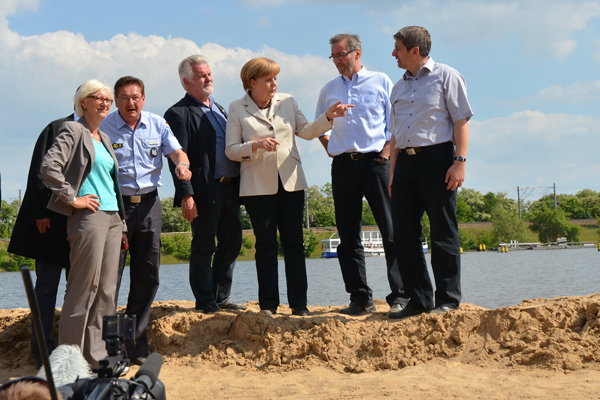 Besuch am 10.06.2013: Bundestagsabgeordnete Dagmar Ziegler, Manfred Metzger (THW), Landrat Hans Lange, Bundeskanzlerin Angelika Merkel, Ministerpräsident Matthias Platzeck, Bürgermeister Dr. Oliver Hermann (vlnr)